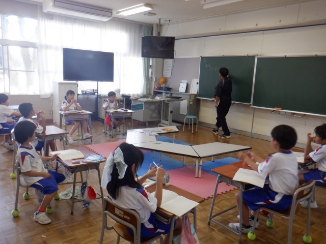 1年生は国語科で漢字の学習が始まっています。漢字を使った言葉リレーをして、漢字の読み方の練習をしていました。制限時間内にみんなでリレーできるか挑戦していました。