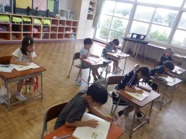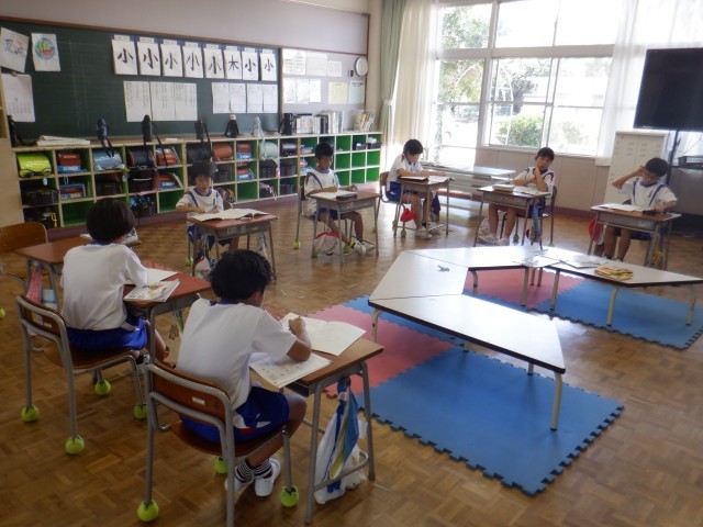 1年生は書写の学習で、横書きの文章の練習をしました。姿勢や鉛筆の持ち方に気を付けて、集中して書いていました。