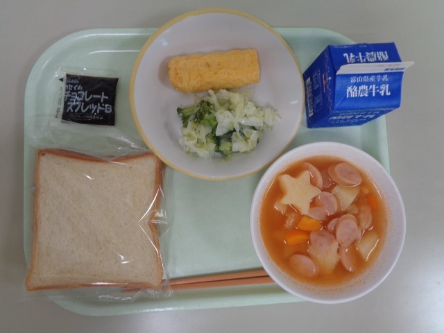 今日の献立は、食パン、卵ロール、フレンチサラダ、ミネストローネ、チョコレートクリーム、牛乳 です。