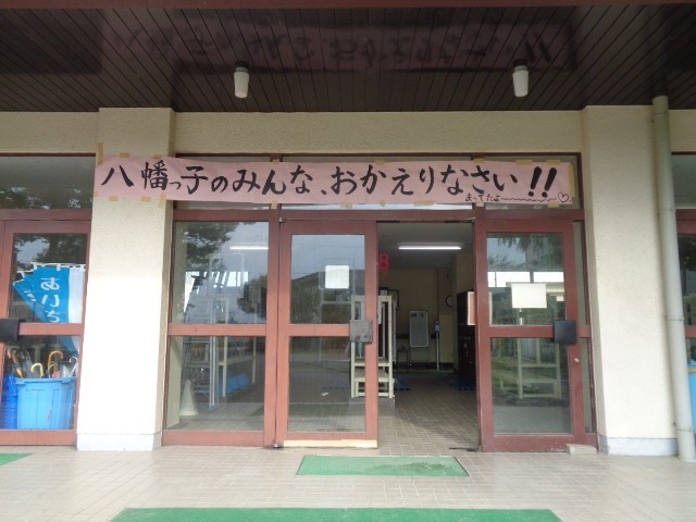 今日から2学期です。児童玄関では、先生方が手作りの横断幕を掲げて、久しぶりに登校する八幡っ子を迎えました。