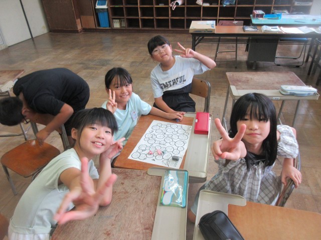 「かぶとむしつかまえた?」「すきなかきごおりのシロップは?」などなど、マス目にとまるごとグループの友達と夏休みの出来事を語り合いました。