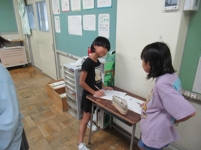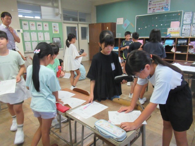 始業式のあとは3年生と一緒に「夏休みビンゴ」を行いました。「アイスクリームを食べましたか?」「セミは見つけましたか?」等、と質問をしてサインをもらい合いました。さらに、「アイスクリームは何味?」や「どこで虫を見つけたの?」等、より詳しく友達の思い出を聞こうとする姿がとても素敵でした。