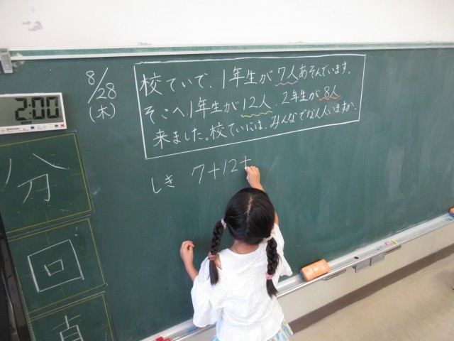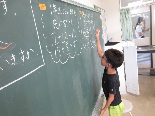 グラウンドに集まる1・2年生の人数の合計について考え、いろんな式をつくり、共通点や違いを見付けました。
