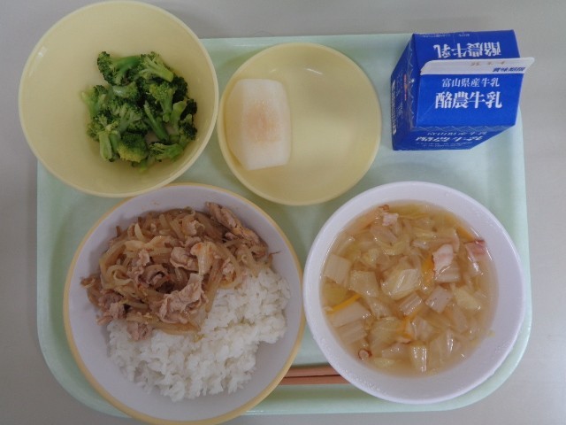 今日の献立は、ごはん、豚キムチ丼、ゆでブロッコリー、白菜スープ、梨、牛乳 です。