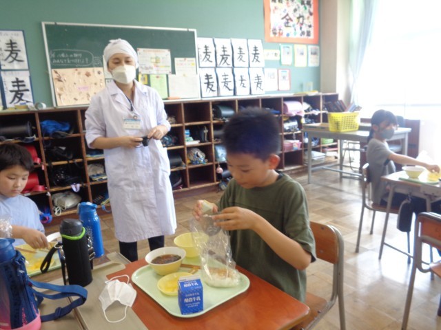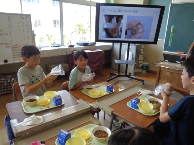 ポリ袋の中にご飯とふりかけを入れ、袋の上から握っておにぎりを作り、袋から直接食べる「セルフおにぎり」を作って食べました。ご飯を握るのは初めて!という子供もいましたが、上手に握っていました。