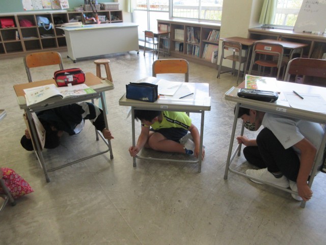 今日は「防災の日」でシェイクアウト訓練をしました。毎年行っていますが、子供たちは真剣に取り組んでいました。地震が起きた時のことをイメージし、机の下に入り、机の脚を対角線上に持ち自分の身を守る動作をしっかり行っていました。