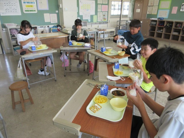 給食時間には、防災の日献立ということで、セルフおにぎりを作りました。子供たちは「ラップじゃないんだ」「ふくろで作るのは初めて」と言いながら上手に作って、食べることができました。
