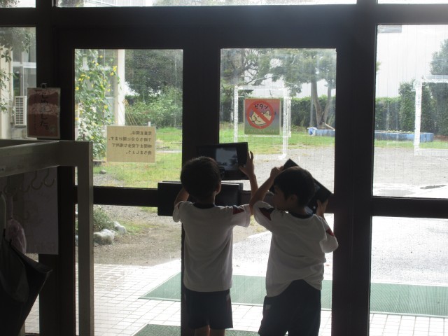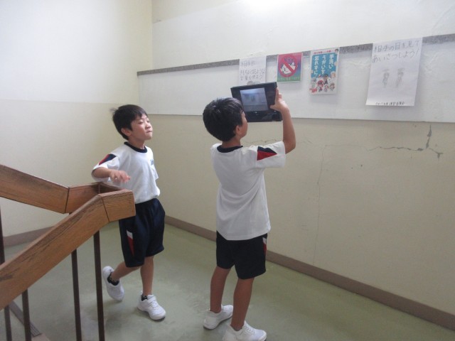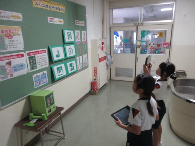 学校にある標識や看板、ちらしから読みとるために、学校中のものの写真を撮る活動をしました。