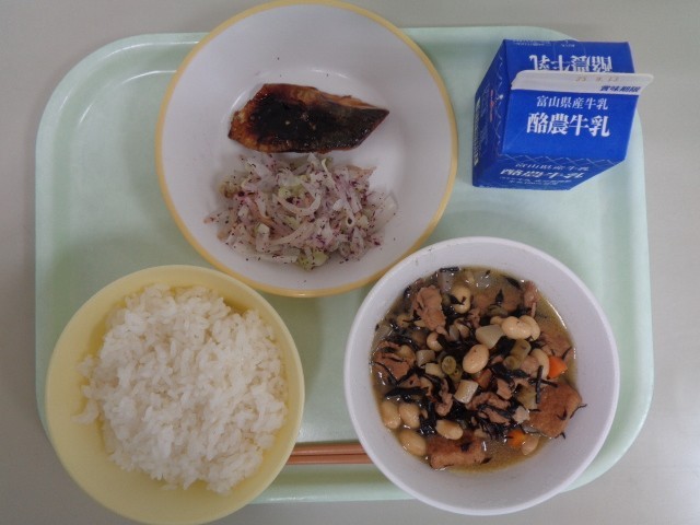 今日の献立は、ごはん、あじのみりん焼き、ゆかり和 え、大豆の磯煮 です。