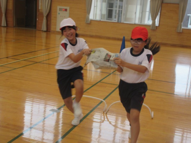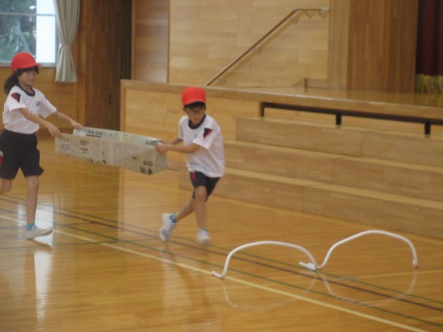 教育実習の先生との初めての授業! 体ほぐしの運動として、友達と協力してボールを新聞紙に載せたり、背中やお腹で挟んだりして走るリレーを行いました。