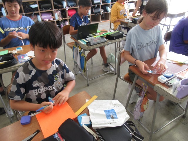 家庭科では、手縫いの学習をしています。各自で準備してきたフェルトやボタン等を使って、マイミニバッグを作ります。