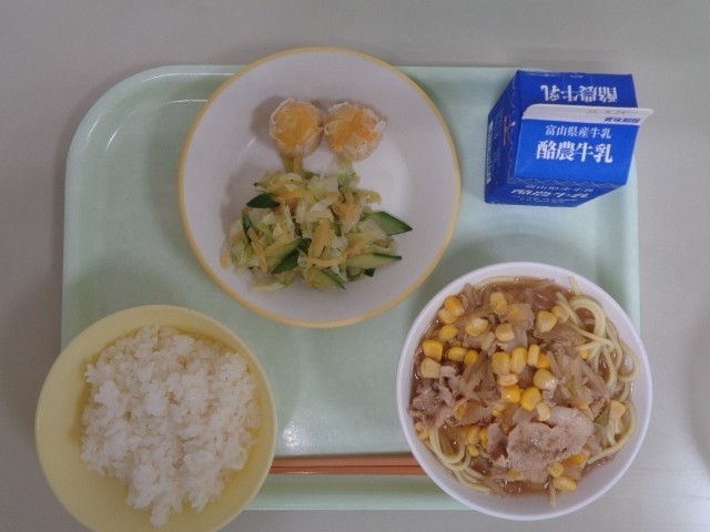 今日の献立は、ごはん、にんじんシューマイ、合わせ和え、サッポロラーメン、牛乳 です。