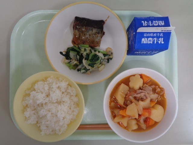 今日の献立は、ごはん、にしんの照り煮、しょうがひたし、トマト肉じゃが、牛乳 です。