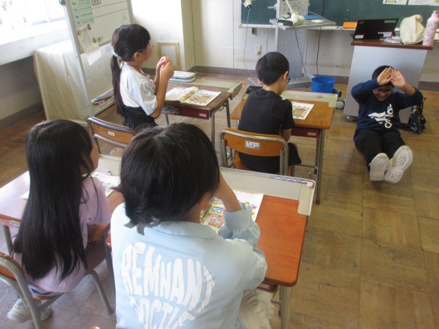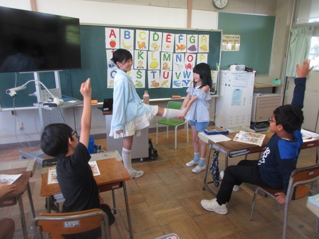 その後は、体全体を使ったジェスチャーゲーム! 二人ペアで出す問題もあり、楽しみながら学習しました。