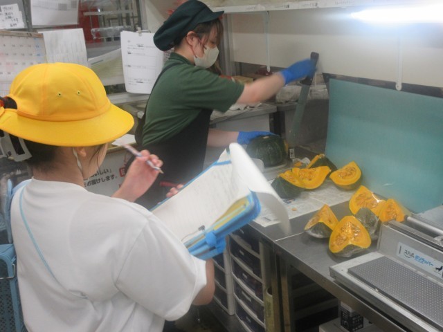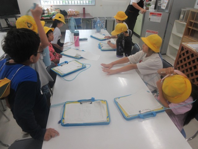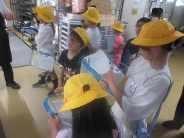お客さんとして行ったときには入ることができない特別な場所、バックヤードにも入らせていただき、実際に野菜や魚を切っているところ、揚げ物やパン作りをしているところを間近で見せていただきました。また、大型の冷蔵庫や冷凍庫にも入らせていただきました。スーパーマーケットさんのご厚意で子供達は買い物に来るお客さんに喜んでもらうための工夫をたくさん見付けることができました。