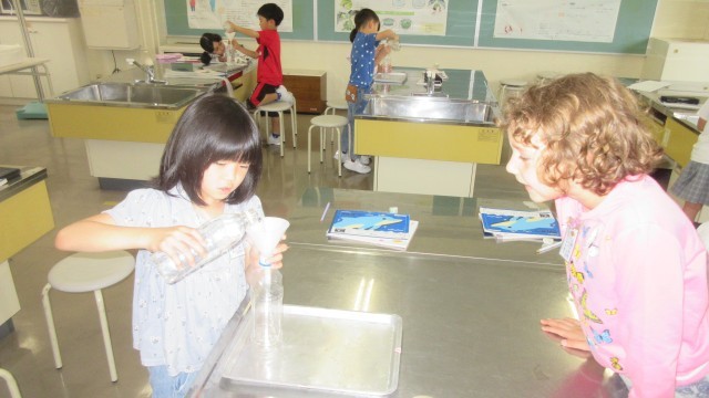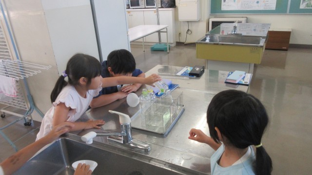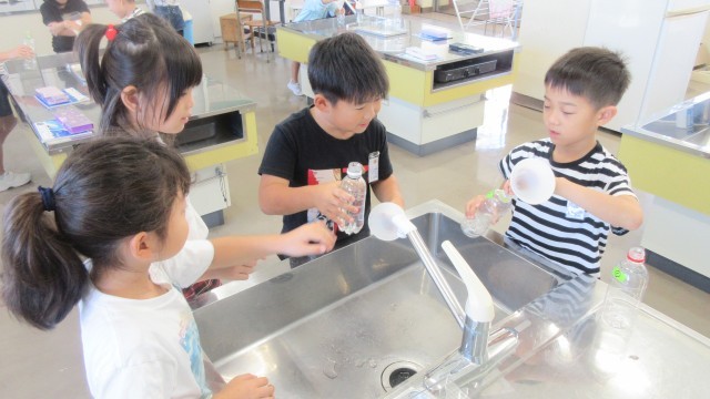 算数「どちらがおおい」の学習では、ペットボトルに入っている水がいちばんおおいのはどれかを調べました。「高さが高い方がたくさん入るよ。ものさしではかってみよう。」「こっちの方が幅が大きい。」「へこんでいるから、あまり入らないんじゃないかな。」と子供たちは予想してから水の量を比べました。