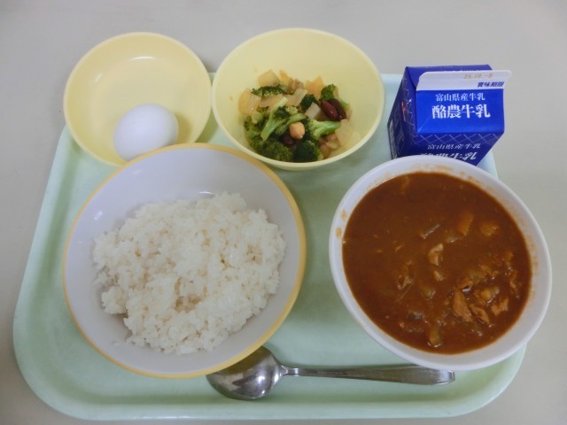 今日の献立は、ごはん、ハヤシライス、ゆで卵、ビーンズサラダ、牛乳です。