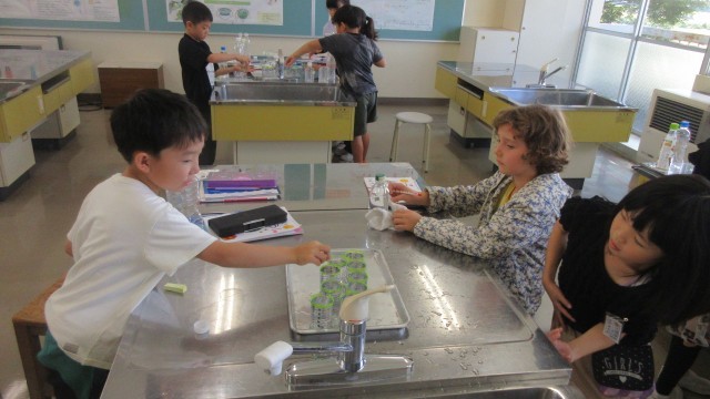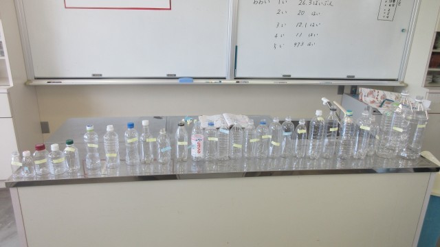 先週から算数科「どちらがおおい」の学習で、水のかさの大きさを比べています。前回は、コップで何杯分か調べて、大きさを比べました。その時に、「2杯と大」「3杯と少し」というように、きりがよくない場面が出てきたときに、「少ないじゃなくで0.2にすればいいんじゃない?小数を使えばいいよ」と子供たちが発言しました。そこで、今日は目盛りがついた1dlマスを使って、家から持ってきたペットボトルの水のかさの大きさを比べました。「3.5杯だ」「こっちは20杯だよ」と子供たちは意欲的に調べていました。そして、みんなで調べたペットボトルを並べて、ランキングに表すことができました。