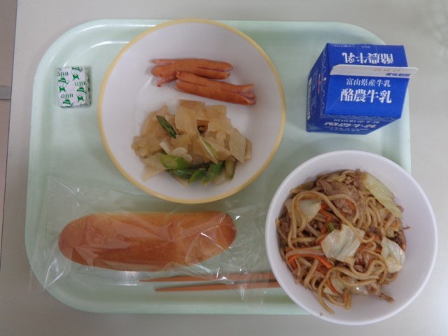 今日の献立は、減量コッペパン、あらびきウインナー、大根サラダ、焼きそば、ポケットチーズ、牛乳 です。