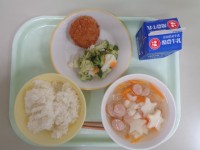 今日の献立は、ごはん、鶏肉のごま揚げ、花野菜サラダ、わかめスープ、牛乳でした。
