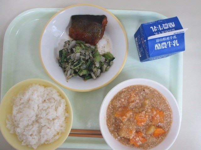 今日の献立は、ごはん、にしんのみぞれ煮、よごし、じゃがいものそぼろ煮、牛乳 です。