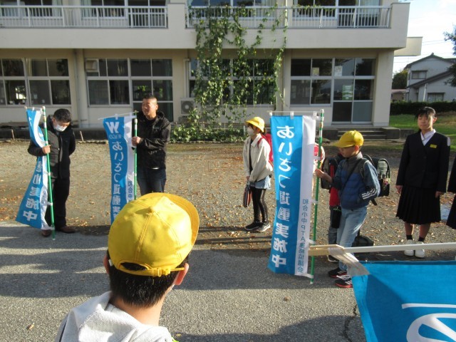児童玄関前に、八幡小学校出身の和合中学校の生徒、運営委員会の児童そしてPTAから2名の方が並びました。