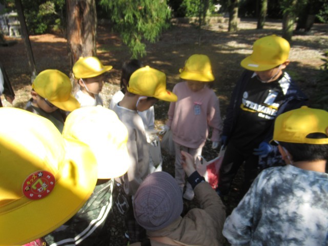 公園では、ドングリやまつぼっくり、イチョウやモミジ等をたくさん拾いました。また、カマキリの卵やキノコ等も発見しました。教育ボランティアの保護者の皆様のおかげで、子供たちはいろいろな秋を味わうことができました。