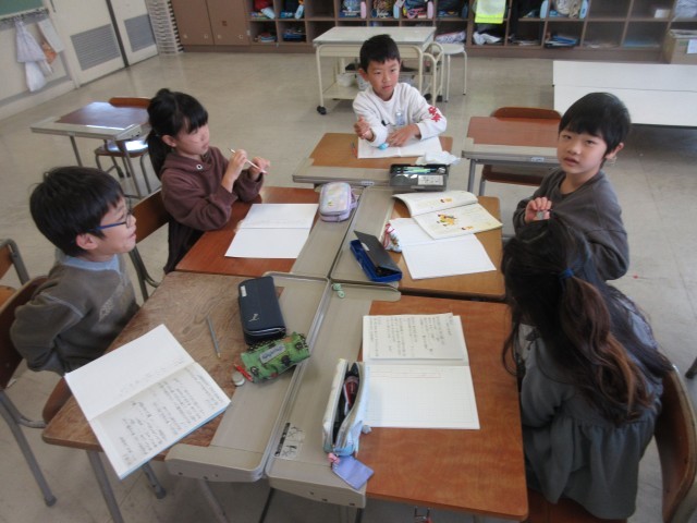 国語の学習では、友達の発言を受けて、話をつないで話し合う活動をしています。友達に「相談したいこと」を事前に伝え、相談ごとを解決するために、グループで話し合います。