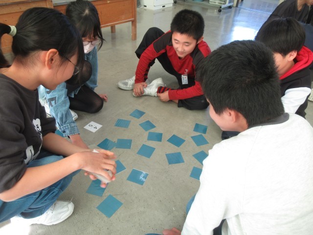 学習の始めということで、「分数神経衰弱」をしました。分数が書かれたカードを使った神経衰弱です。