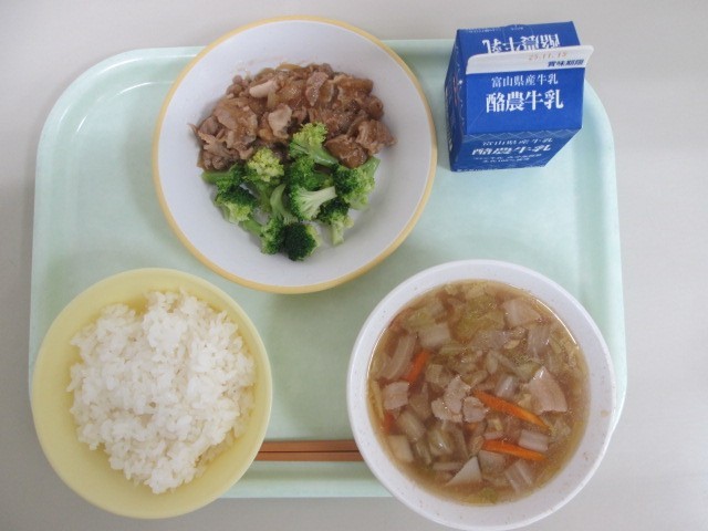 今日の献立は、ごはん、豚肉のおろし炒め、ゆでブロッコリー、ワンタンスープ、牛乳 です。