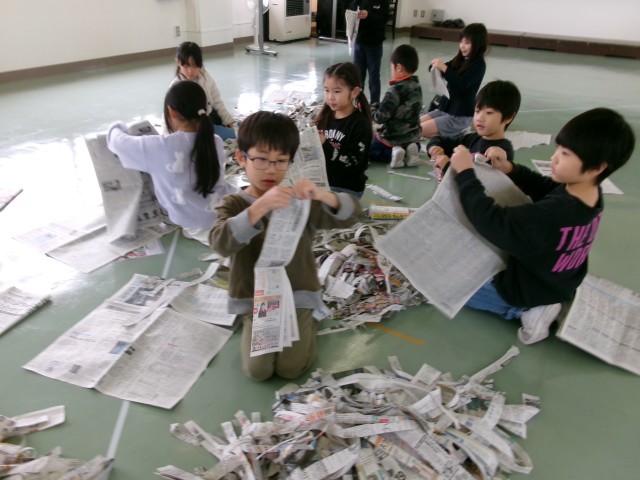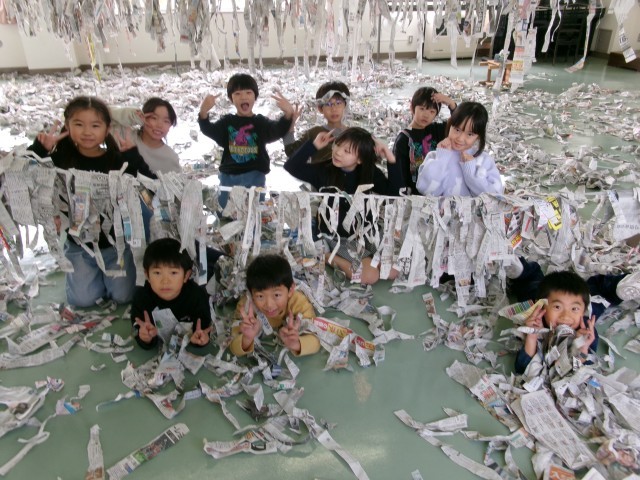 たくさんの新聞紙をみんなで切ったり破ったりしたものをつなげます。