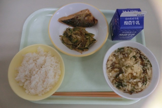 今日の献立は、ごはん、ふくらぎの西京焼き、大根のえごまサラダ、卵ともずくのスープ、牛乳 です。