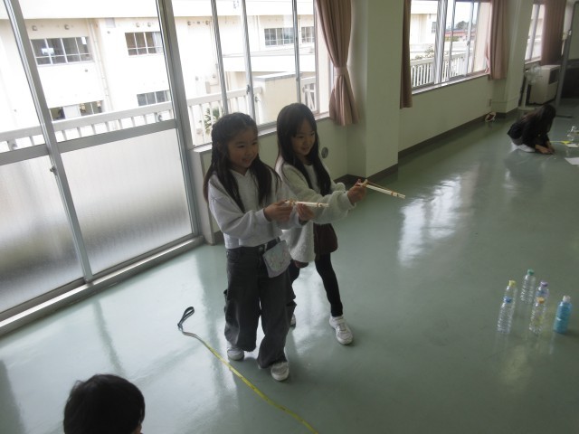 どうしたら自分や友達がわくわくできるか考えながら、ゴムの数を変えたり、ペットボトルに入れる中身を考えたりして、工夫して作っていました。