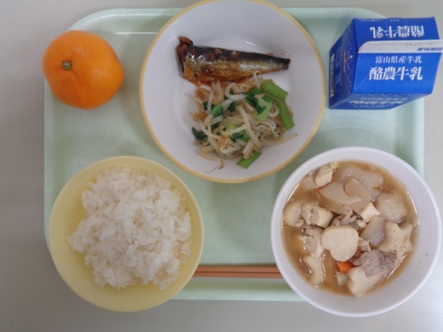 今日の献立は、ごはん、いわしの梅煮、もやしのおひたし、ごまけんちん、みかん、牛乳 です。
