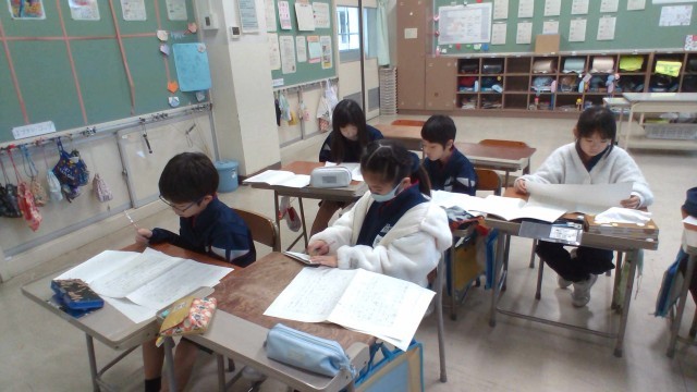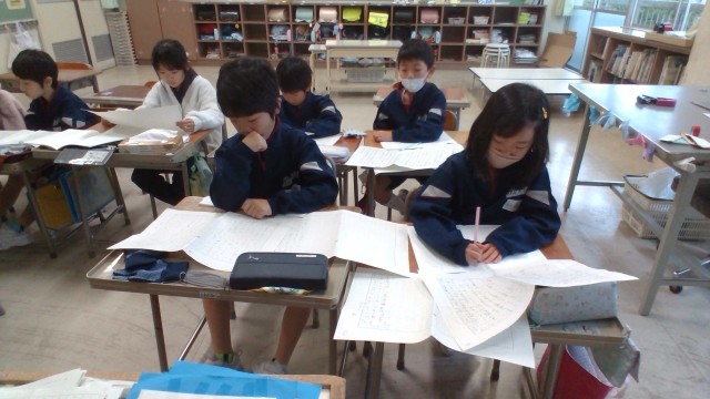 今日は、一人一人がつくったお話をみんなで読み合い、いいなと思ったところや、面白いなと思ったところを見付けました。