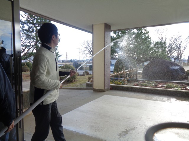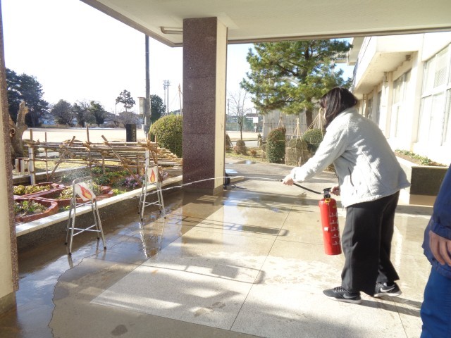 後半は、消火栓や消火器の利用の仕方を学ぶ実地訓練。実際に放水も行いました。