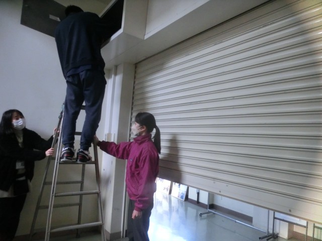 前半は、出火場所や役割を事前に決めないブラインド避難訓練。防火シャッターも閉めて行いました。
