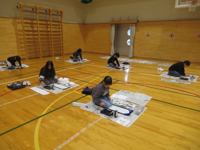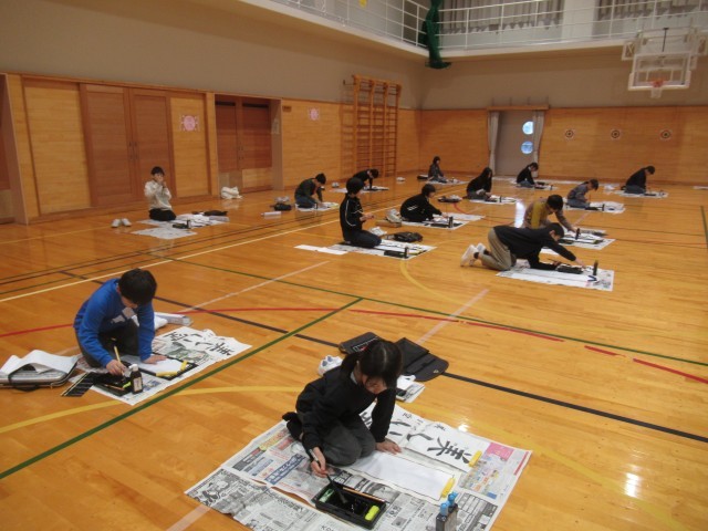 始業式後の書初大会では、真剣な表情で一文字一文字に思いを込めて書き上げていました。