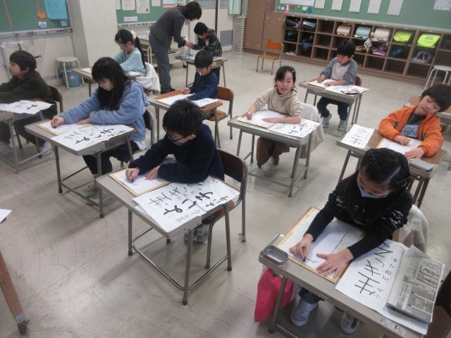 普段は賑やかな教室も、この時ばかりはシーンと静まり返り、心地よい緊張感に包まれました。お手本をじっくり見つめ、一画一画を丁寧に、力強く書く姿。その真剣な眼差しからは、「3学期も頑張るぞ」という強い決意が伝わってくるようでした。