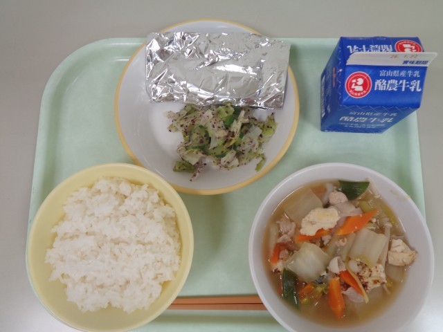 今日の献立は、ごはん、さばの銀紙焼き、ゆかり和え、はくさい鍋、牛乳 です。