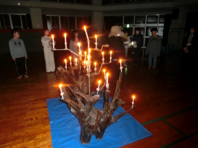 夜は、キャンドルサービスを行いました。火の神から火を受け取り、その火を火の子たちが友達に分け与えます。ろうそくの火が消えないように気を付けて、燭台までろうそくを運びました。