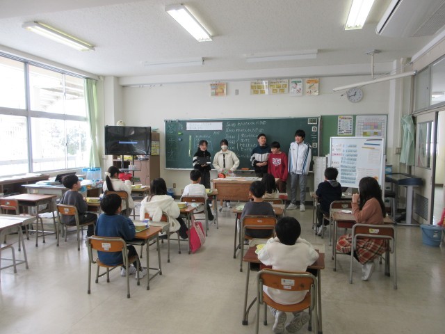 今週は、給食の時間に各クラスをまわり、スライドを使って調べてきたことを伝え、作成したちらしを配りました。