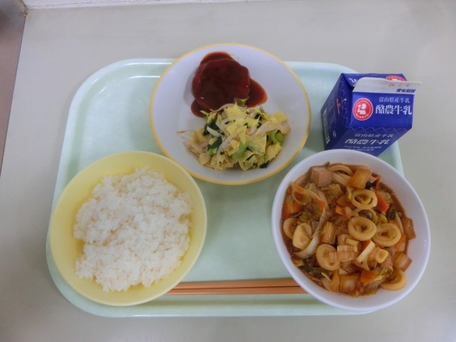 今日の献立は、ごはん、みそ煮込みうどん、すり身のお好みソースがけ、ゆば和え、牛乳 です。
