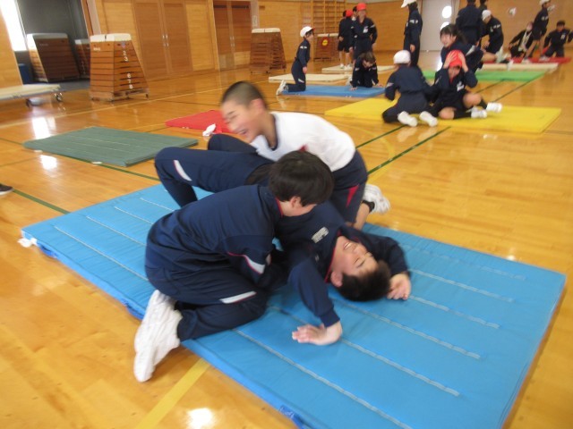 体育科では、跳び箱運動について学習しています。ウォーミングアップとして、背支持倒立やブリッジからの立ち上がり等をしました。