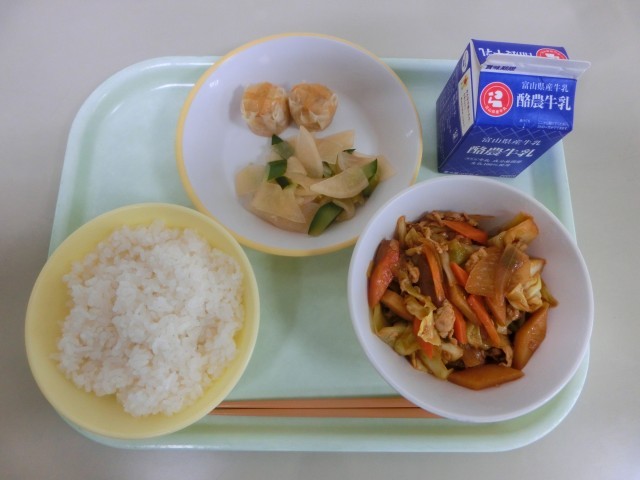 今日の献立は、ごはん、にんじんシューマイ、甘酢和え、回鍋肉、牛乳 です。