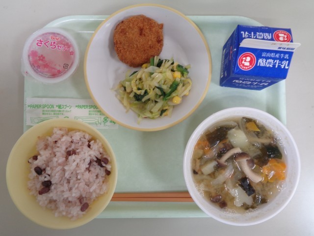 今日の献立は、赤飯、とんかつ、コーン和え、みそ汁、お祝いゼリー、牛乳 です。