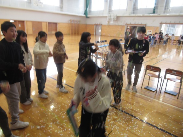 最後は、6年生の退場です。全校みんなとハイタッチをして退場したり、5年生が放った紙ふぶきの中を通り抜けたりしました。
