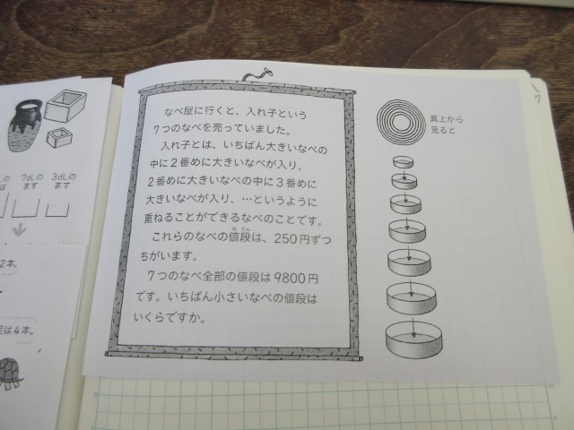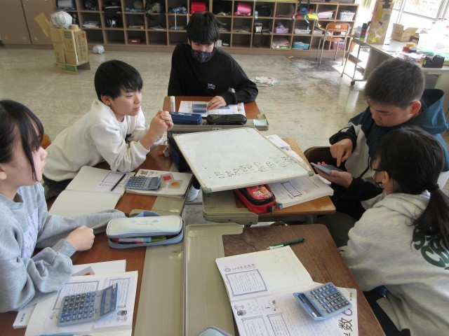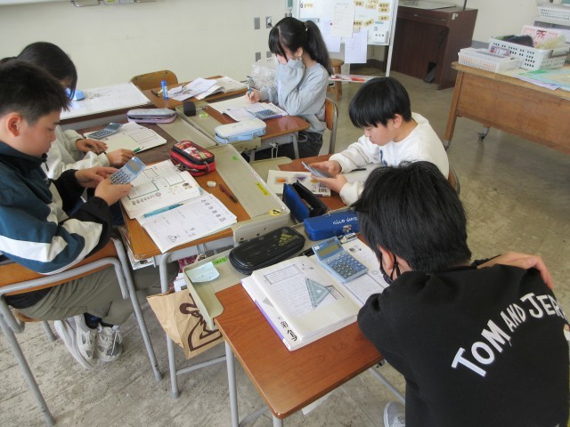 最後の単元の算数卒業旅行の問題を解いています。今日は和算コースをしました。入れ子算の問題では、様々な考えがでました。初めに分かった子にも「教えて」とは言わずに、「自分で考えたいからちょっとまって」と、いろいろな方法で答えをだそうと取り組んでいました。どうやって考えたのかを5人で聞き合うと、「なるほど~」「じゃあ、こういう場合は?」「なんで、その数が分かったの?」など、知りたい!という思いをもっている様子が伝わってきました。