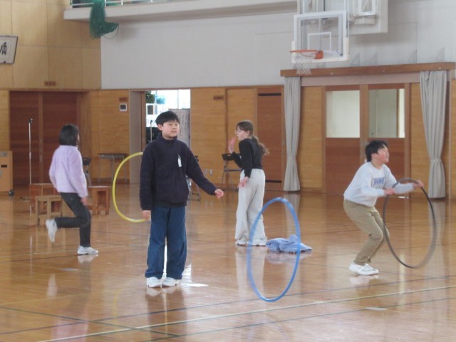 昼休みは、体育館でフラフープをしている子が多くいました。卒業式のため体育館の反面が使えないため、激しい運動はできません。行き着いた先がフラフープ遊びでした。