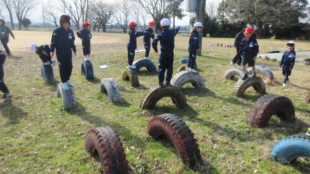 子供たちは、元気いっぱいに学校の遊具で遊んでいます。のぼり棒に挑戦したり、タイヤを使って多様な動きを楽しんだりしました。体育の学習で身につけたことを生かして、タイヤの上をジャンプして移動したり、跳び箱のようにリズムよく跳び越えたりする頼もしい姿も見られます。休み時間にも進んでグラウンドへ飛び出し、50m走や遊具遊び等、思い思いに体を動かすことを楽しんでいます。
